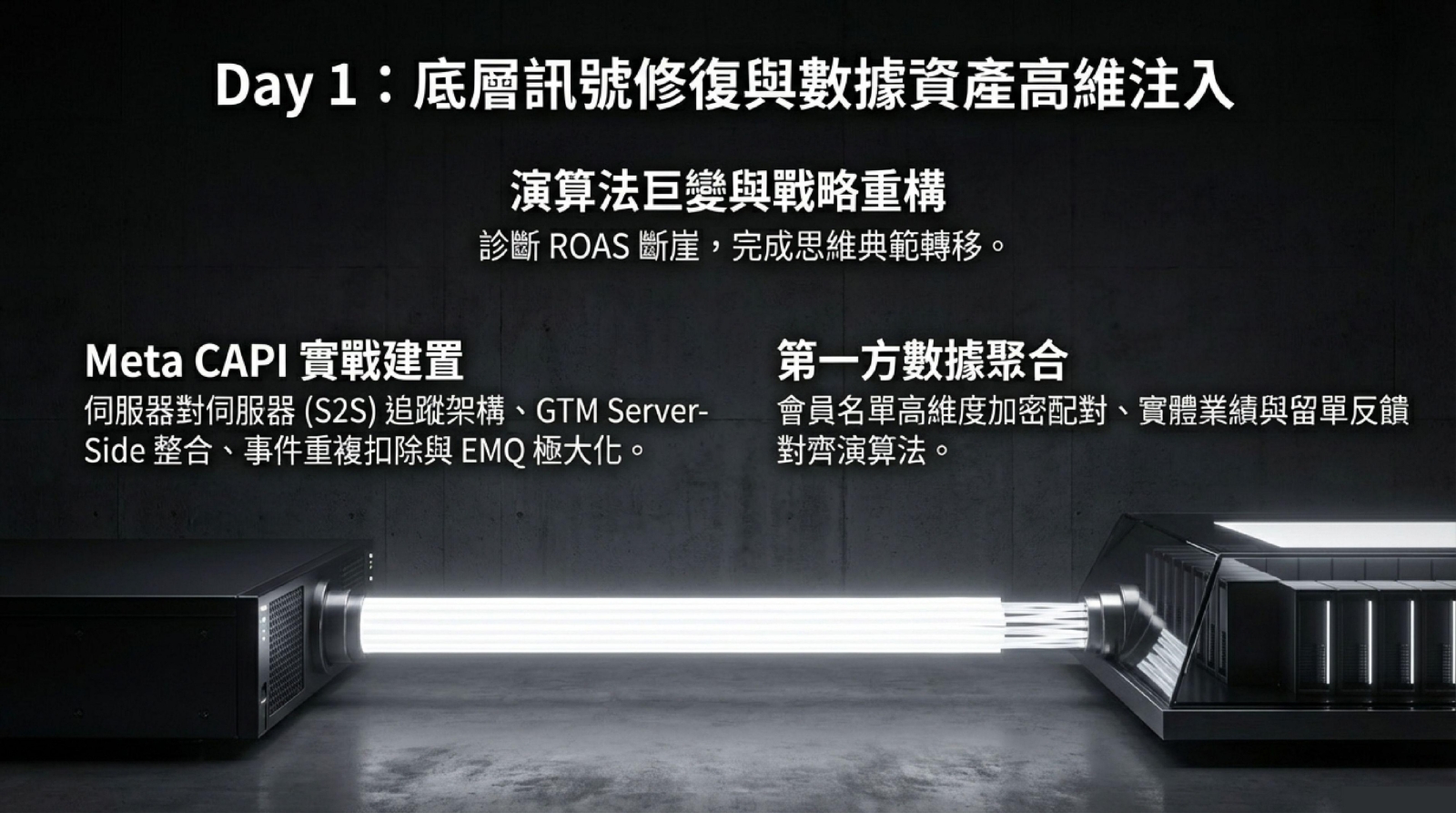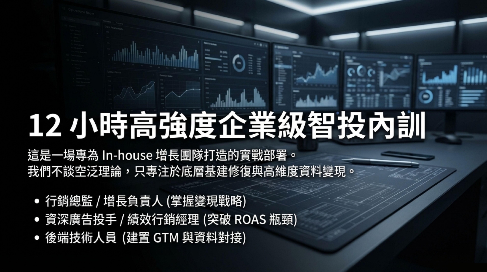 這是一場專為企業內部增長團隊打造的 12 小時高強度實作內訓。我們不談空泛的行銷理論,只專注於底層基建的修復與高維度資料的變現。