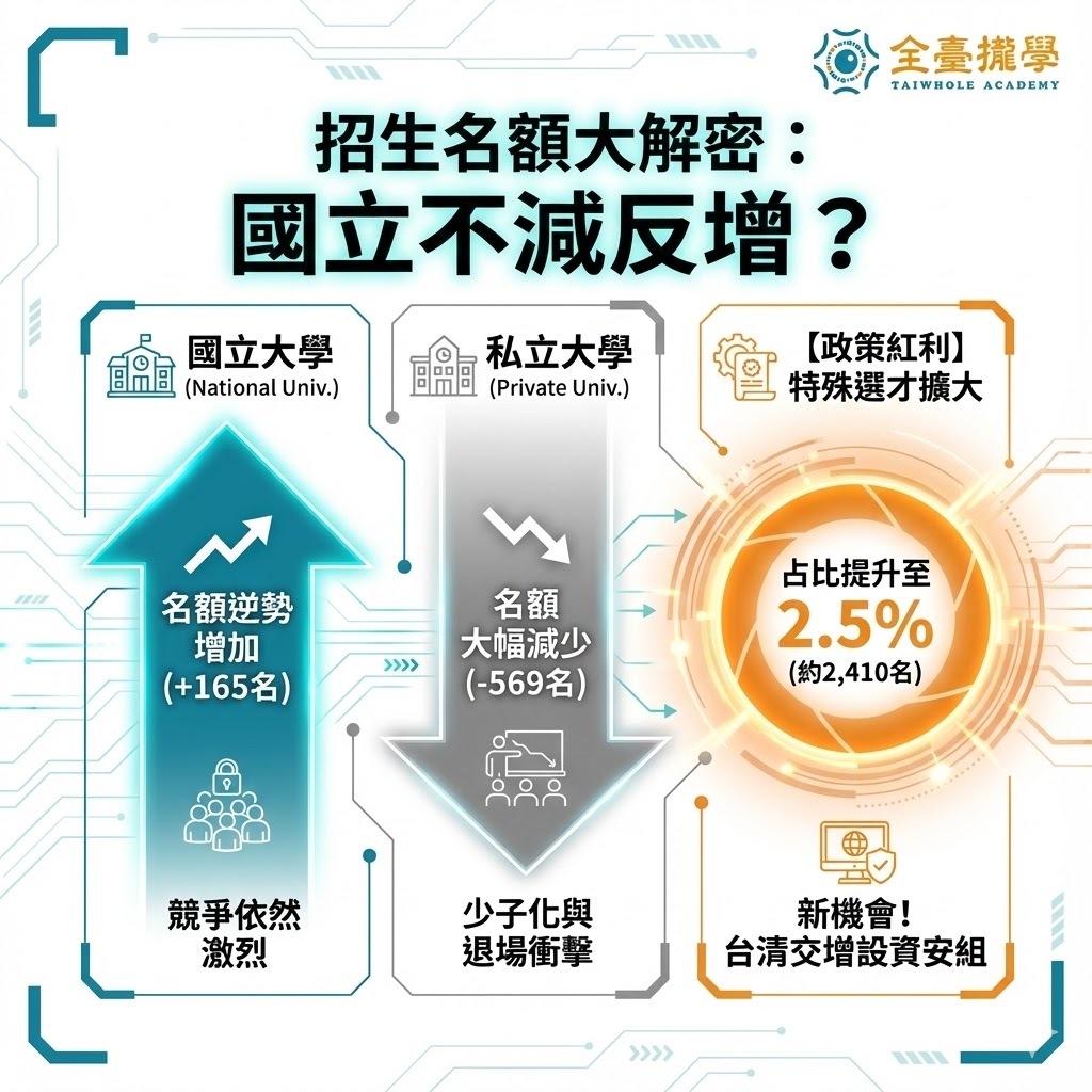 A: 總名額有減少,但主要集中在私立大學(減少569名)。國立大學的申請入學名額反而微幅增加165名。這代表前段國立大學的競爭依然激烈,而中後段私校則因名額縮減(學校主動寄存或減招)而未必會變得更好考 。